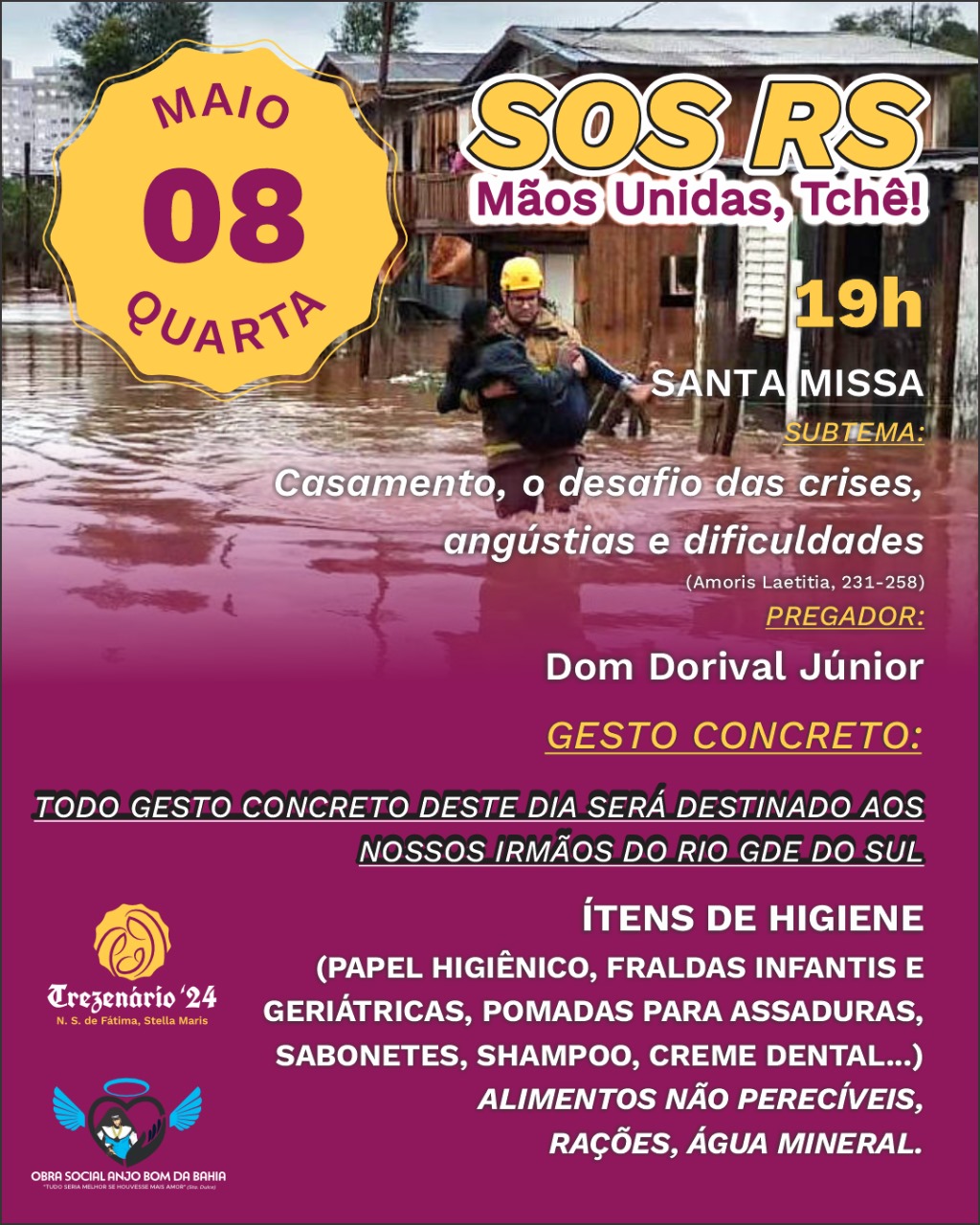 Em ação solidária aos nossos irmãos do Rio Grande do Sul, que hoje sofre com a destruição causada pelas fortes chuvas na região, a Paróquia Nossa Senhora de Fátima, Stella Maris, destina as arrecadações do gesto concreto da noite de hoje 08 de maio para a população afetada. Para isso, fique atento você que deseja ajudar nessa corrente humanitária para o que pode ser doado.
